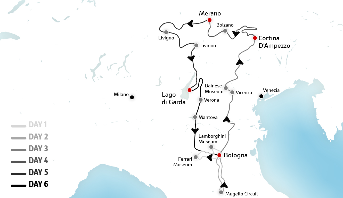 HomeSeven days and 1,500 km along the most beautiful roads in Italy, discovering the history and culture of our country, with a visit to the prestigious Dainese, Ducati, Ferrari and Lamborghini museums in the heart of the Motor Valley.