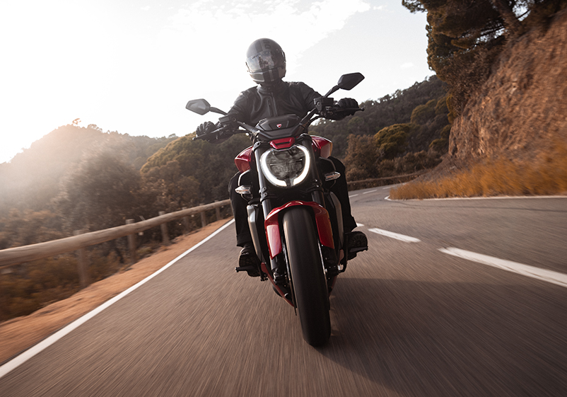The front DRL with double C design has the typical Ducati naked shape and narrows towards the top, highlighting the sleek appearance of the front end and wrapping itself around a single bifunctional module that has a more aggressive and technical look, while also showing off the heat sink as a design element. The turn signals are integrated and create a blade of light that makes for a smooth, homogeneous look.