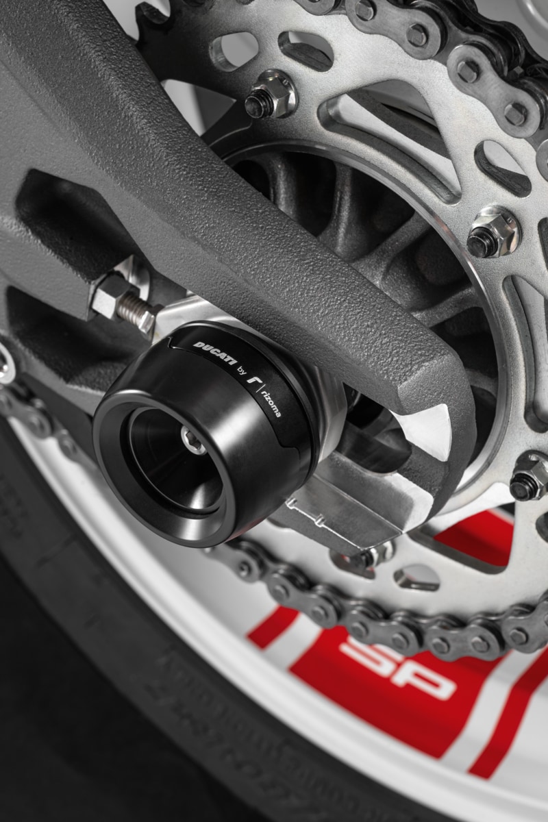 El inconfundible diseño Ducati se une a la experiencia de Rizoma para dar vida a un elegante accesorio para la rueda trasera. Realizado en aluminio anodizado de alta calidad, también cuenta con un hermoso mecanizado que confiere estilo al tren trasero de la moto.