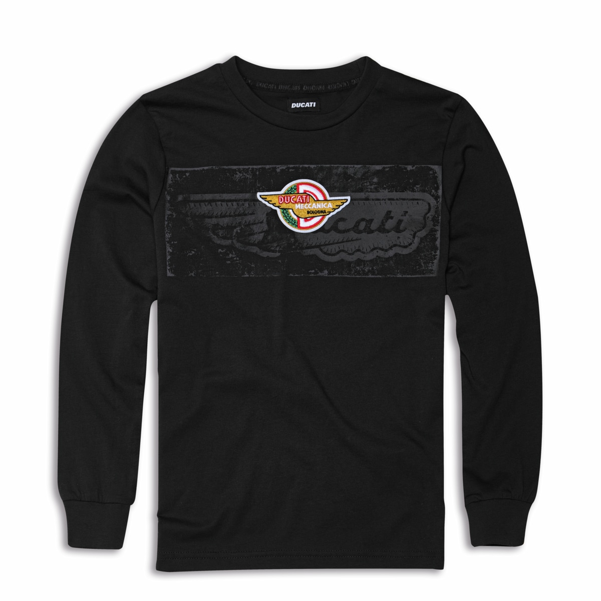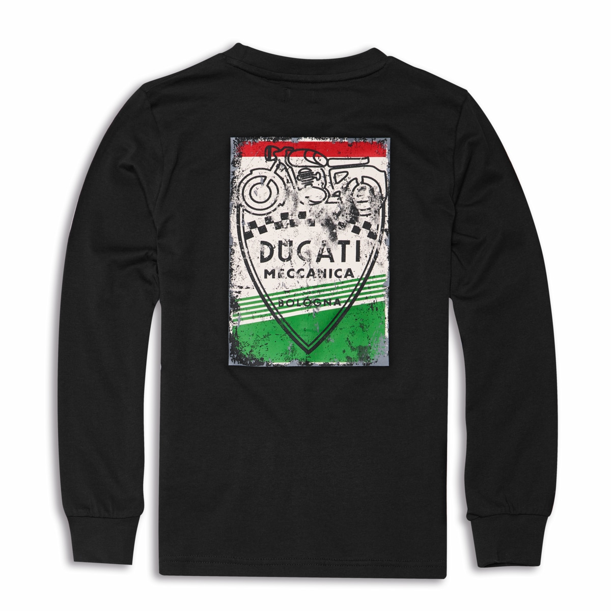 Camiseta de mangas largas Historical 2.0, de punto de algodón puro para garantizar confort y transpirabilidad. El color negro es el fondo en una representación llena de significado: en la espalda, un estampado dedicado a los logotipos históricos Ducati Meccanica celebra los orígenes de la marca, mientras que la parte delantera se ha personalizado con un patch y un estampado coordinado. Una prenda que une estilo y memoria, pensada para los pequeños apasionados del mundo Ducati.