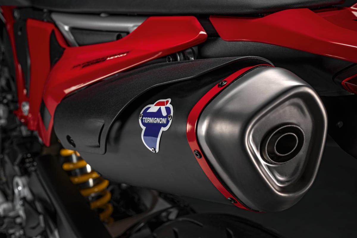 Manufactured in collaboration with Termignoni and type-approved for road use, they feature black steel sleeves for a gritty, eye-catching style that enhances the bike's racing DNA and the look of the rear end. The ideal accessory to enhance the sporty lines of the Hypermotard 698, while respecting the limits imposed by the highway code.