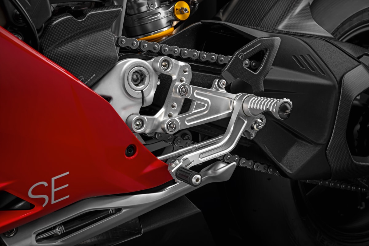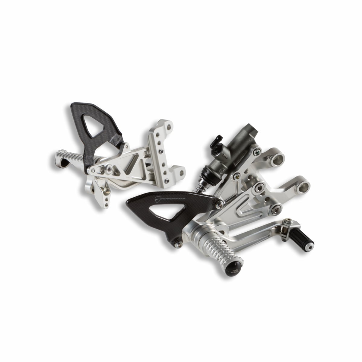 Designed and developed for exclusive track use by official Ducati test riders. Given this sporty nature, they can only be used in inverted gearbox mode and can only be fitted with a racing exhaust system. Compared to the original equipment, they can be adjusted to three positions for greater performance and manoeuvrability, adapting to the rider's physical characteristics. All the levers are equipped with bearings to reduce play and improve riding feel, making these footpegs the essential component for optimum performance on the racing circuit, for experienced Ducatistas who demand only the best from Ducati accessories.