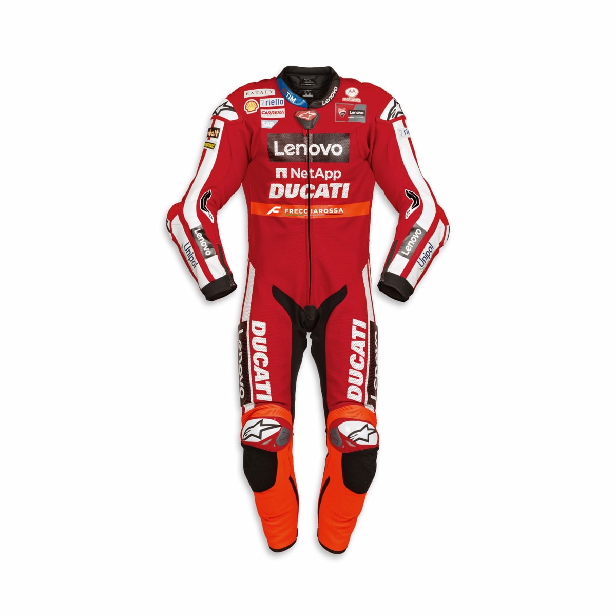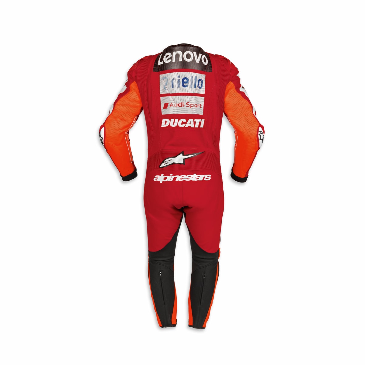 High performance and maximum safety with the Ducati Corse GP Team 26 professional suit, a faithful reproduction of the Ducati Team MotoGp 2026 color scheme. Produced in a limited edition by Alpinestars exclusively for Ducati, it is made of durable 1.3 mm thick perforated cowhide leather. The many elasticized inserts facilitate movement while ensuring riding comfort. The suit, certified in compliance with CE standards, is equipped with double-layer inner reinforcement on the seat. To ensure safety with lightweight and reduced thickness, there are areas of high-strength technical fabric on the shoulders, elbows and knees. The sleeves and legs are pre-curved to follow the movement. The protectors on shoulders, elbows and knees are at the highest level of quality with advanced technological solutions. Features include a low-profile collar, calf expansion zipper and removable inner liner in breathable fabric. Available only in standard sizes with men’s fit, it is provided with back protector housings.
