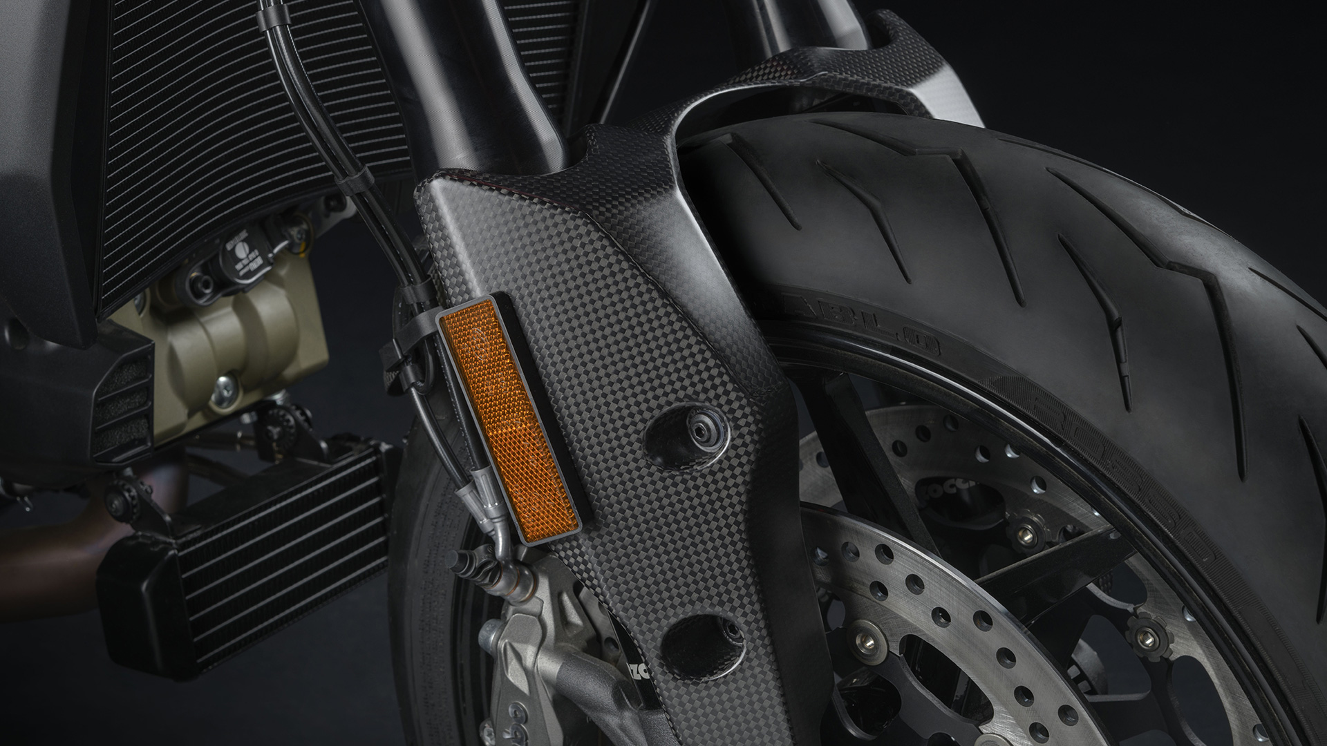 To make the Hypermotard even more aggressive and captivating without losing elegance, you can choose from the many components in carbon fibre or billet aluminium, a selection of which is offered in the Style package. The fairing, rear mudguard and tank guard in carbon fibre are completed by the tank cap and water pump cover in billet aluminium.