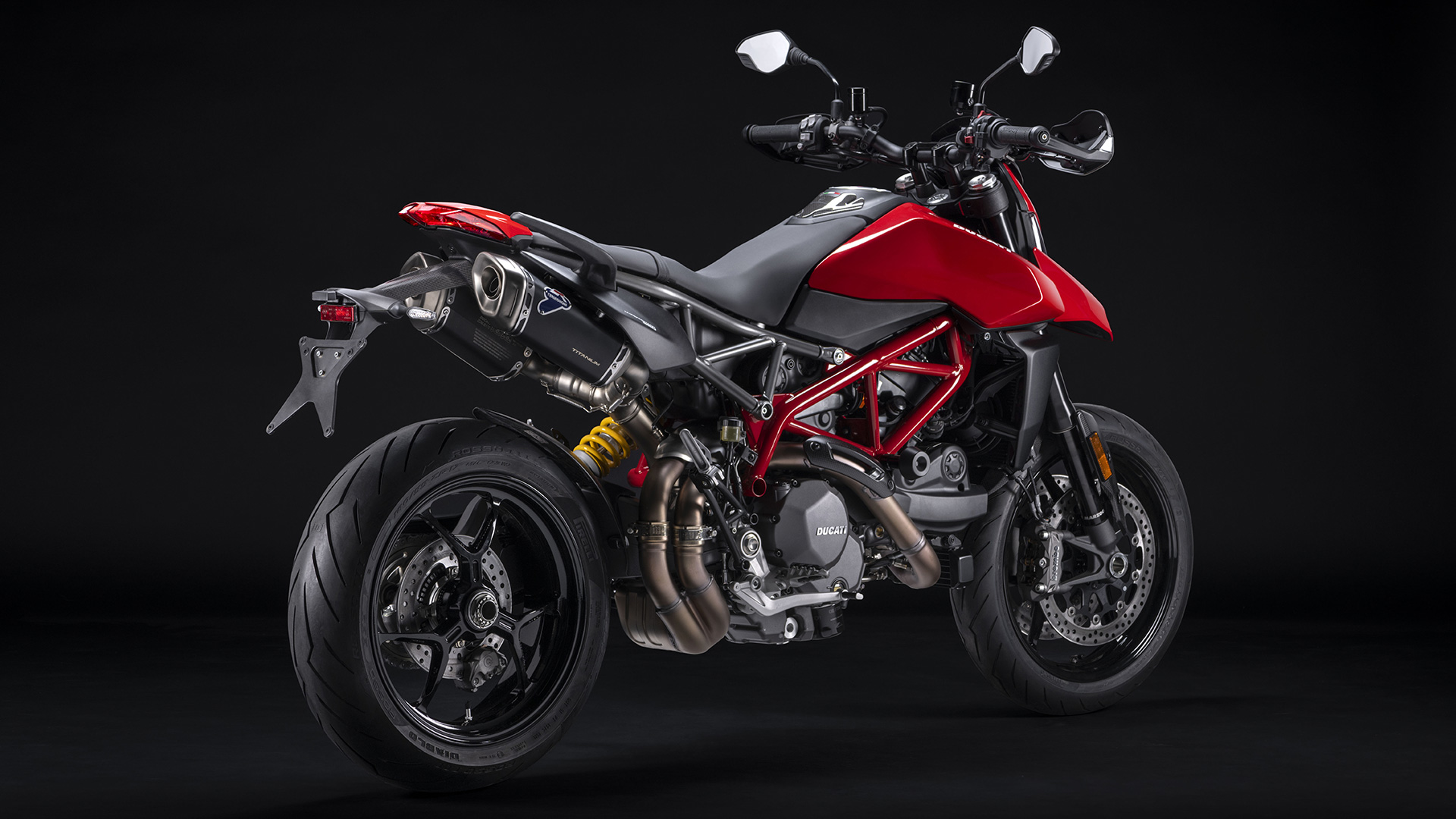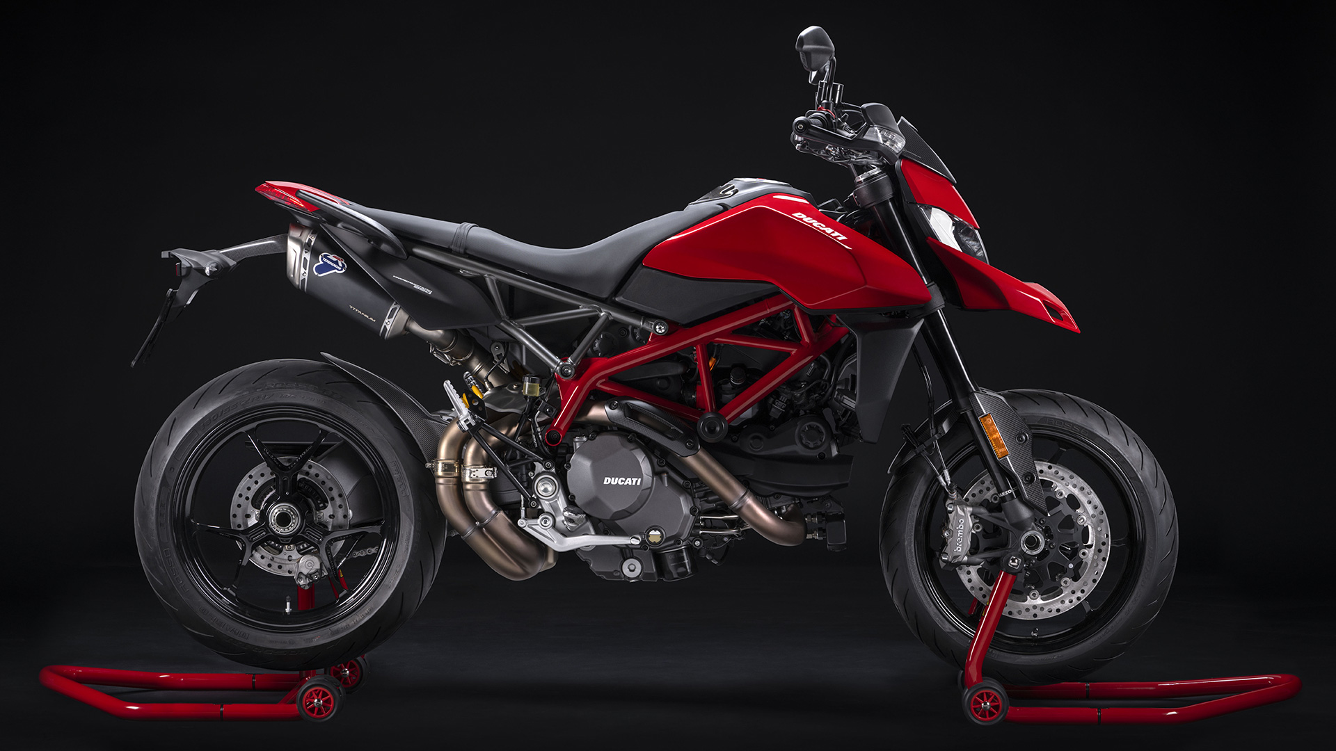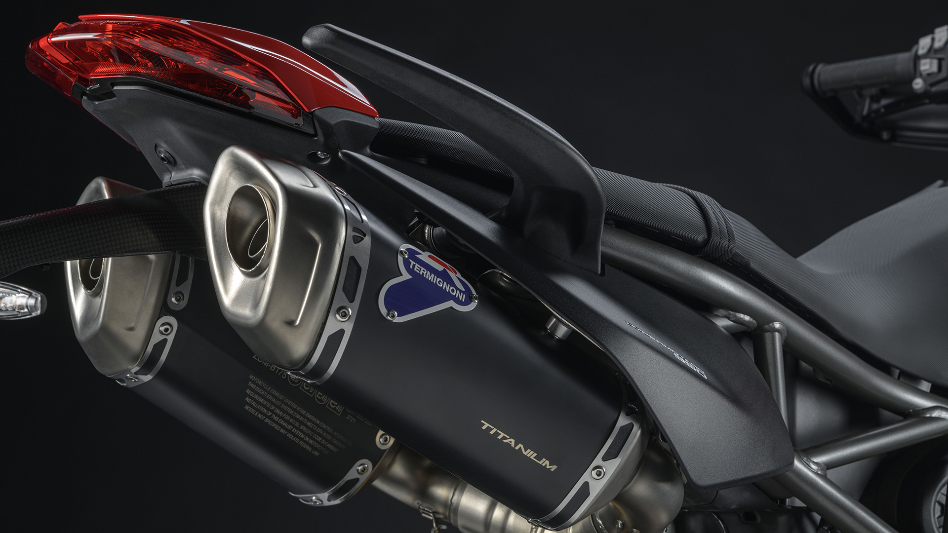 The Sport package includes a selection of accessories designed to enhance the sporty character of the Hypermotard 950. A carbon plate holder, flanked by approved Termignoni silencers with titanium sheaths and steel bottoms and dynamic LED indicators, give the "Hyper" an even more dynamic and edgy image.