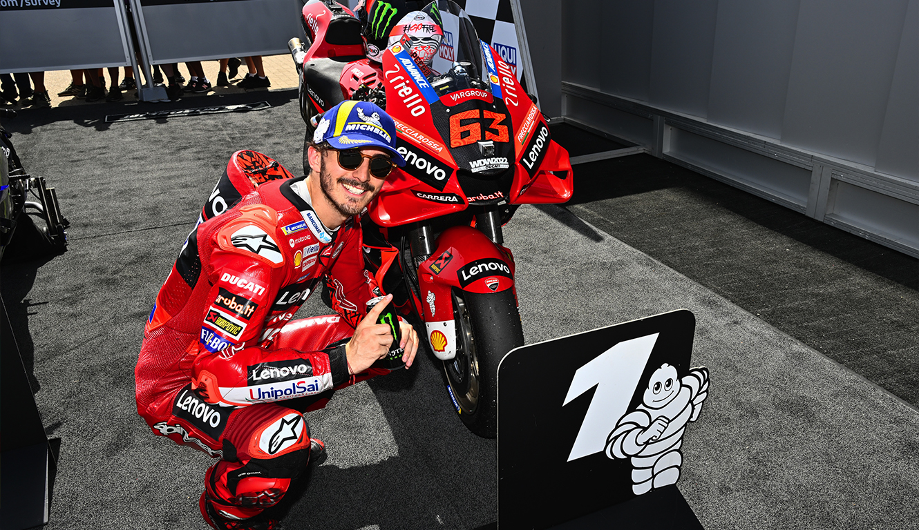 Pecco Bagnaia took his third pole position of the season at the Sachsenring circuit, which hosts the MotoGP Grand Prix of Germany this weekend, by closing Q2 with a fastest lap in 1:19.931. The Ducati Lenovo Team rider had already dropped under the 1:20 wall in this morning's FP3, closing with the fastest time of 1:19.765, again improving on the circuit's all-time lap record that already belonged to him after yesterday's free practice. Thanks to this result, Bagnaia becomes the second Ducati rider, after Stoner, to have the most pole positions in MotoGP.