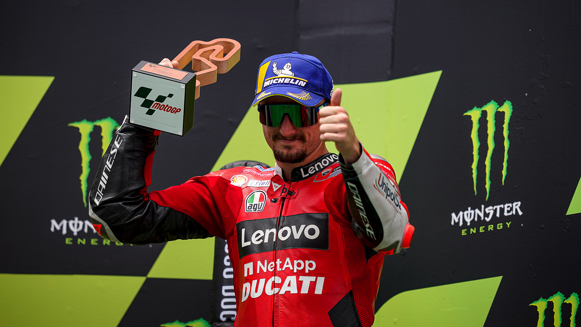 The Australian rider, who departed from the front row of the grid from second place, took an early lead after the start, but he eventually dropped back after a few laps. Despite this, Miller continued to ride at a consistent pace, managing the tyre wear and waiting until the race's final stages to try to get closer to the podium. Fourth with nine laps to go, Jack got behind the Desmosedici GP of Johann Zarco, with whom he was able to catch first Mir and then Quartararo. The latter was first overtaken by the Pramac Racing Team rider and then went wide between Turn 1 and Turn 2, cutting the chicane to rejoin. Because of this mistake, the Frenchman had to serve a three-second penalty, which saw him drop back to fourth at the end of the race and hand the third step of the podium to Miller, who was right behind him at the finish line.