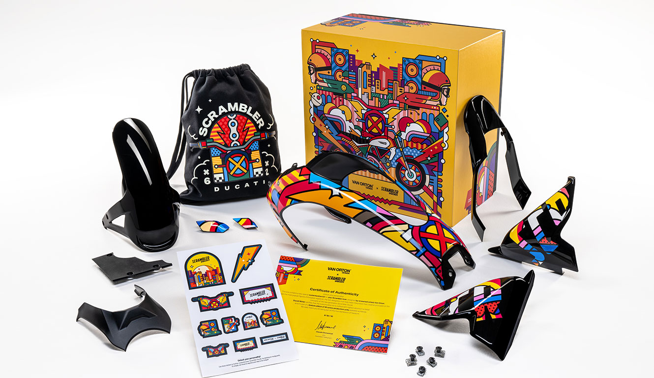 The “Van Orton x Scrambler Ducati” cover kit can already be ordered in the Ducati dealerships. It will be delivered inside a special box with dedicated graphics in which the kit will be accompanied by a certificate of authenticity and a series of surprises in true "Land of Joy" style, including some collectible stickers to be used on any occasion or to make your bike even more unique. The capsule collection will soon be available for purchase in Ducati dealerships.