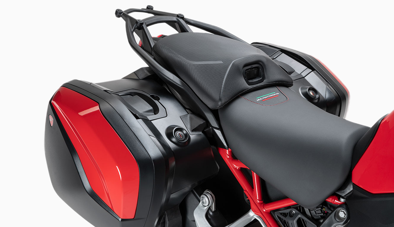 For those who love to travel as a couple, it is essential to ensure maximum comfort for the passenger as well. Accessories such as a heated seat (available on the Multistrada V4 for both the rider and the passenger) allow you to enjoy the ride even on the coldest days and on mountain roads, while the practical passenger grab handles ensure comfortable support at all times of the journey and are available as an accessory for the SuperSport 950, Monster and Hypermotard 950.