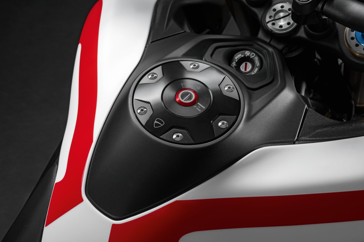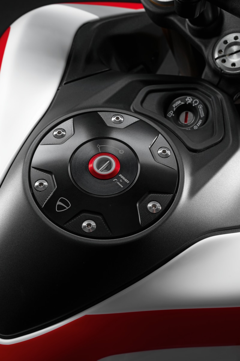 The unmistakable Ducati design is combined with Rizoma's experience to create a unique detail, made entirely in Italy, which enhances the bike's aesthetics. Made from billet aluminium, it maintains its original appearance over time thanks to high quality anodising. Equipped with an anti-tamper system to guarantee maximum safety. The special key supplied, which reproduces the Ducati shield, makes this accessory stand out for its design and makes refuelling much faster, in a perfect combination of functionality and style.