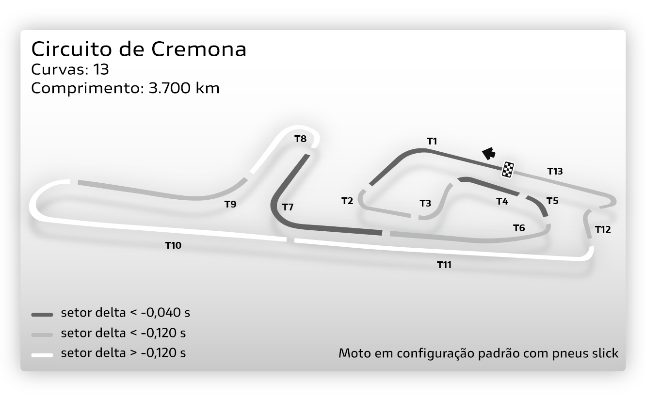 Cada curva é cuidadosamente examinada e o aumento no desempenho efetivo pode ser mais ou menos significativo dependendo dos movimentos feitos naquela área específica da pista. Como você pode ver no infográfico acima, a nova Panigale V4 melhora em todos os setores, mas o maior aumento de desempenho ocorre nas áreas em destaque.