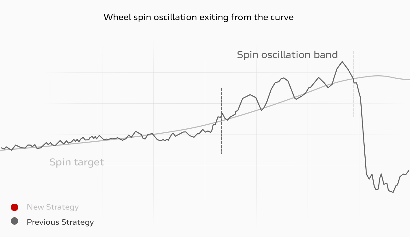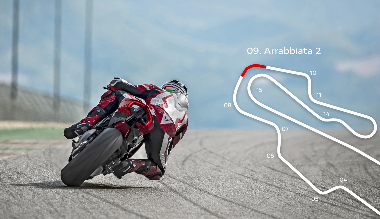 When the bike is leaning over, the rider can use the throttle control like a direct interface with the system and, only for requests exceeding 120 Nm, obtain an increased rear wheel slip compared to that allowed by the normal DTC EVO 2 level of intervention. This will trigger a gradual oversteering that permits the rider to actually close the trajectory with the rear wheel, while the system is controlling the safety parameters.