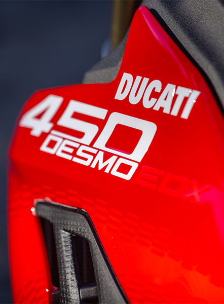 The Desmo450 EDX engine is equipped with Desmodromic distribution, the system used on all Ducati racing bikes, including those in MotoGP. This feature offers several advantages to the Desmo450—allowing the engine to run at very high revs, providing greater power that increases the chances of starting faster than rivals, while also making the bike easier to handle in tight passages.