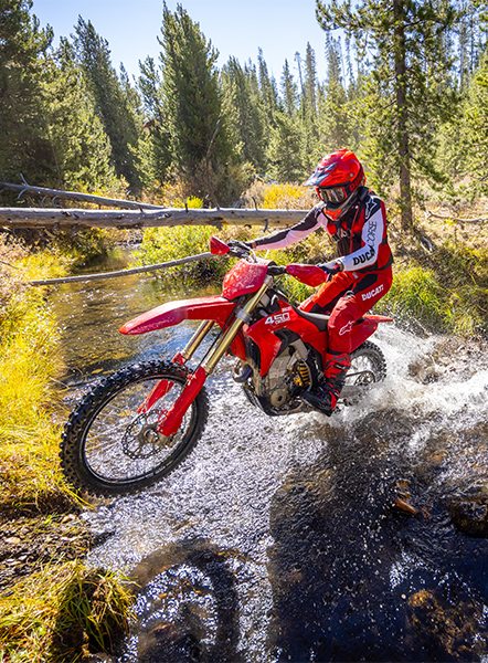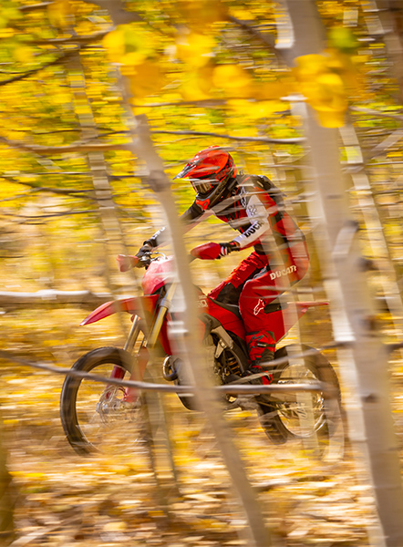 A bike born from Ducati's longstanding philosophy: experimenting and testing solutions in racing competitions to then bring them to production bikes, also drawing from Ducati Corse's experience in MotoGP and Superbike. A light and reliable bike, with benchmark performance in the category. The Desmo450 EDX, just like the MX, is thus capable of amplifying the riding skills of riders, whether professional or amateur, offering the confidence that allows them to push their limits forward.