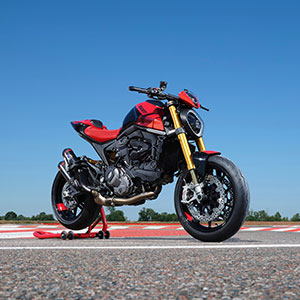 The Brembo braking system is based on dual 320 mm front discs, with M4.32 radial calipers and dedicated pads, developed specifically to offer a softer initial bite combined with high braking power. This makes the Monster safe and fun to ride when exploiting its performances, while also being very manageable in an urban environment. The Diablo Rosso IV tires, in sizes 120/70 and 180/55, are Pirelli's top of the range for road use, offering grip and safety.