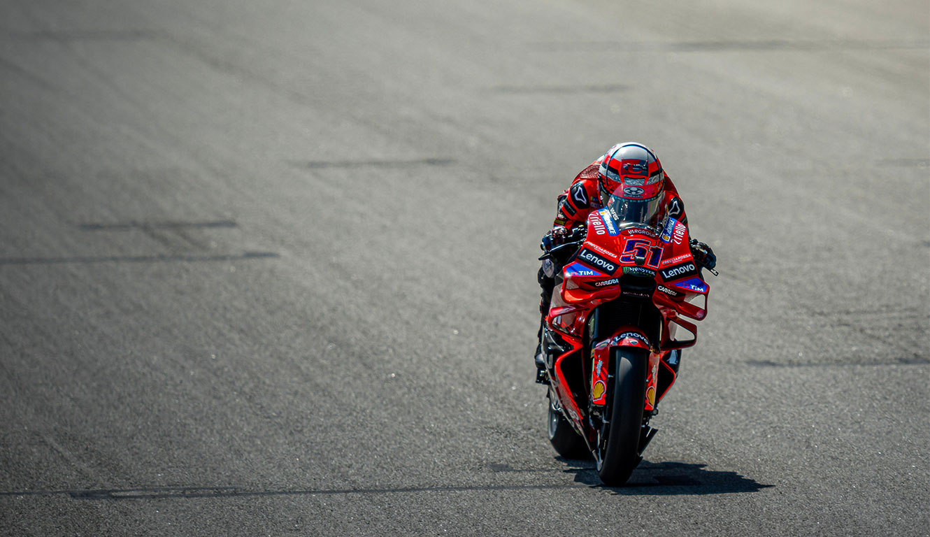 Bagnaia lost the lead on lap two but kept Alex Márquez in close range for more than half the race distance. After defending second place well from Pedro Acosta’s attacks, he dropped to third and began to lose ground. With three laps remaining, Pecco returned to the pits and retired due to a flat rear tyre. Michele Pirro completed the weekend with a seventeenth-place finish.