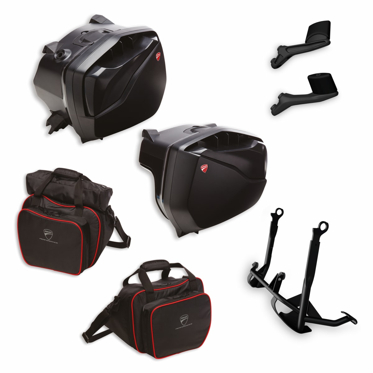 Le Touring n’a jamais été aussi pratique et confortable grâce à ce kit d’accessoires dédié aux pilotes qui aiment parcourir de longues distances à moto. Il comprend des valises latérales rigides pour emporter tout le nécessaire, des sacs internes pour valises latérales afin de garder chaque chose parfaitement organisée, des supports inférieurs pour valises latérales en plastique, ainsi qu’une béquille centrale idéale pour stationner en toute sécurité dans toutes les conditions.