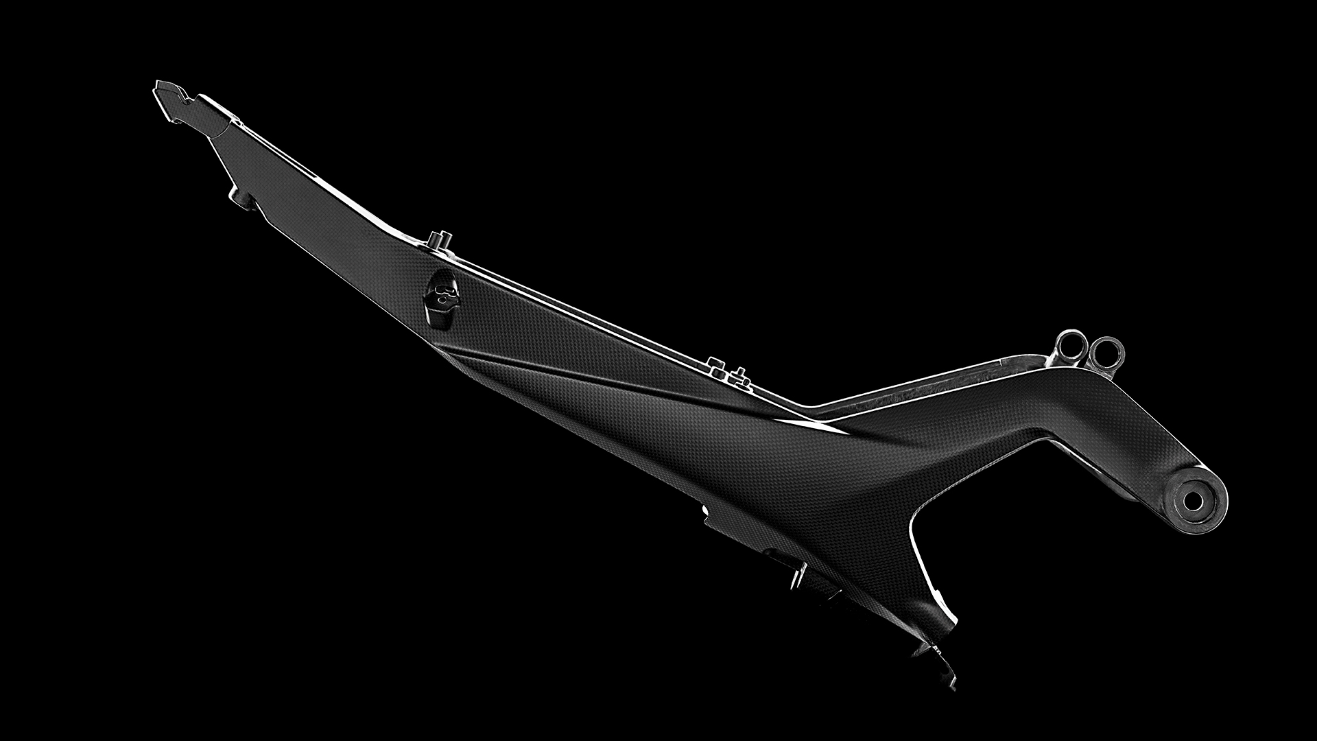 « La complexité des surfaces influence grandement la possibilité d’utiliser un matériau futuriste tel que le carbone unilatéral, d’où la nécessité de redessiner complètement la géométrie du bras oscillant arrière pour l’améliorer, tout en maintenant un dialogue constant avec le Design Center pour rester cohérent avec le design Ducati. L’optimisation morphologique est l’une des activités qui a demandé le plus de travail du point de vue des essais et des simulations virtuelles de résistance. Le résultat, c’est un rapport de rigidité spécifique sans précédent. Une moto allégée de toutes les charges plus périphériques et donc incroyablement plus agile et maniable. Mais aussi plus stable grâce aux nouvelles géométries. »