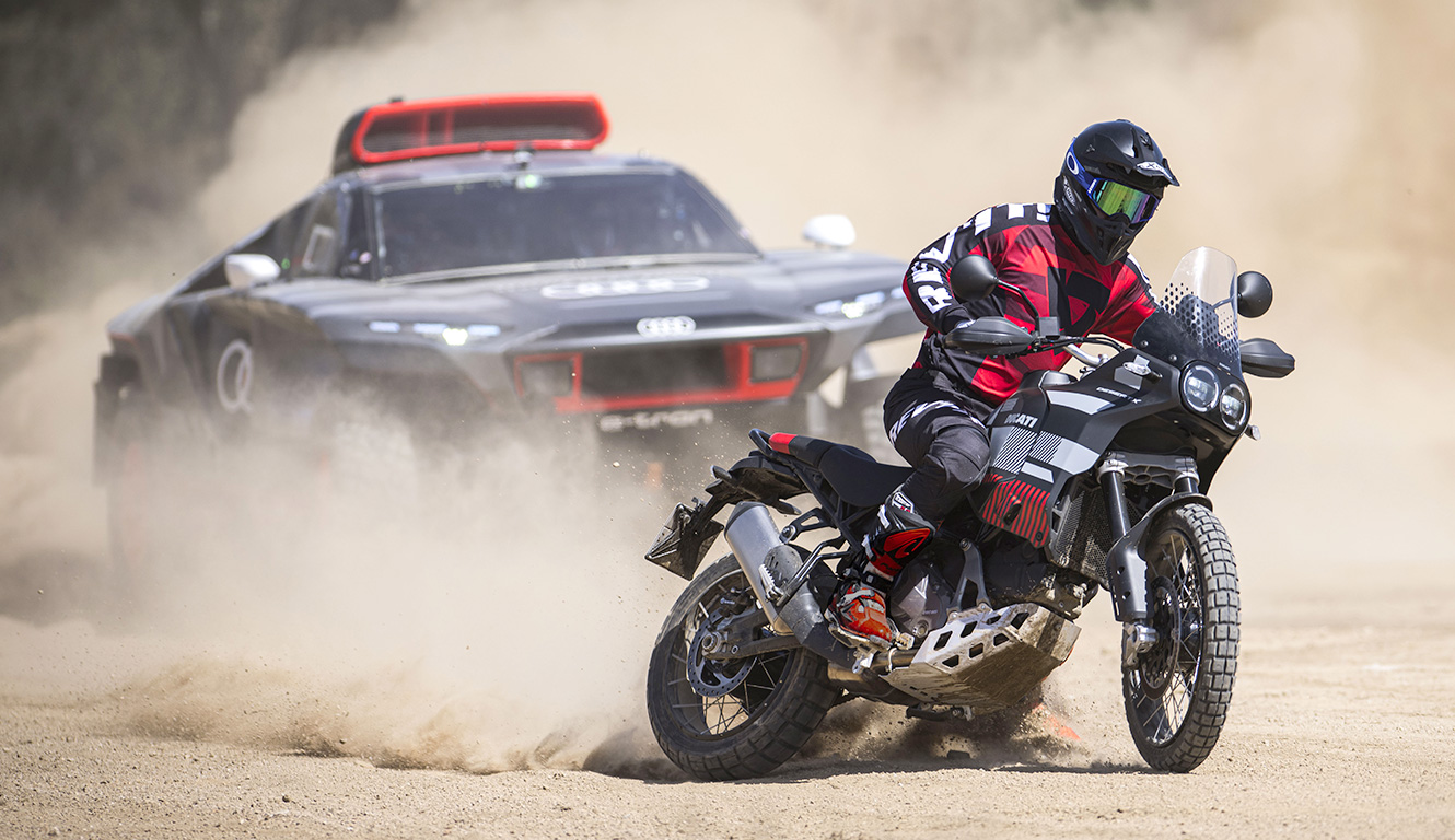 Pour célébrer cet événement, le Centro Stile Ducati a créé une livrée exclusive pour la DesertX inspirée de celle de la RS Q e-tron. Cette moto spéciale était pilotée par Petrucci, qui a fait le show avec le duo Sainz / Cruz sur une piste technique tout-terrain (ici le lien vers la vidéo).