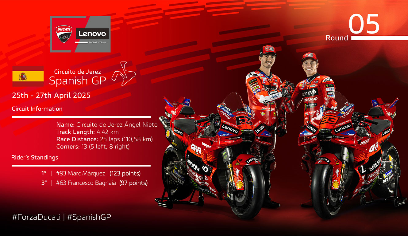 Service à la clientèleAprès le 1-2 au Qatar, Marc Màrquez et Francesco Bagnaia sont à l'œuvre à Jerez de la Frontera pour le premier week-end européen du MotoGP S25. Une piste, l'espagnole, capable de mettre en valeur les caractéristiques techniques de la Desmosedici GP avec 5 victoires Ducati, dont 4 au cours des 4 dernières années et trois sceaux consécutifs de Bagnaia dans les trois dernières éditions ('06 Capirossi, '21 Miller, '22 '23 '24 Bagnaia).