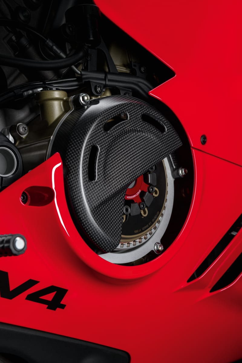 Comme en MotoGP, où la seule chose qui compte est la performance maximale, l’embrayage à sec est rendu disponible pour les autres modèles V4 où il n’est pas prévu de série. Il s’agit d’un embrayage STM EVO-SBK, réalisé en aluminium usiné dans la masse avec cloche et empilage des disques de 48 dents ; les disques sont 9 menés et 9 garnis avec un diamètre de 138 mm. Dans l’utilisation de la moto sur piste, on obtient des bénéfices importants dans le feeling de conduite, en particulier l’embrayage à sec garantit une fonction anti-rebondissement plus efficace dans les rétrogradages plus agressifs et une fluidité plus élevée dans toutes les phases de « off-throttle », à tout cela s’ajoute la possibilité de personnaliser le niveau de frein moteur « mécanique » en choisissant un ressort secondaire différent parmi ceux disponibles sur le catalogue. Une autre caractéristique importante est l’absence de résistance opposée par l’huile moteur et une huile plus propre, étant donné que les poussières d’usure des disques ne sont pas convoyées dans le circuit de graissage. Le caractère racing de l’embrayage à sec et son sound iconique représentent une valeur ajoutée enthousiasmante pour les Ducatistes plus passionnés.
