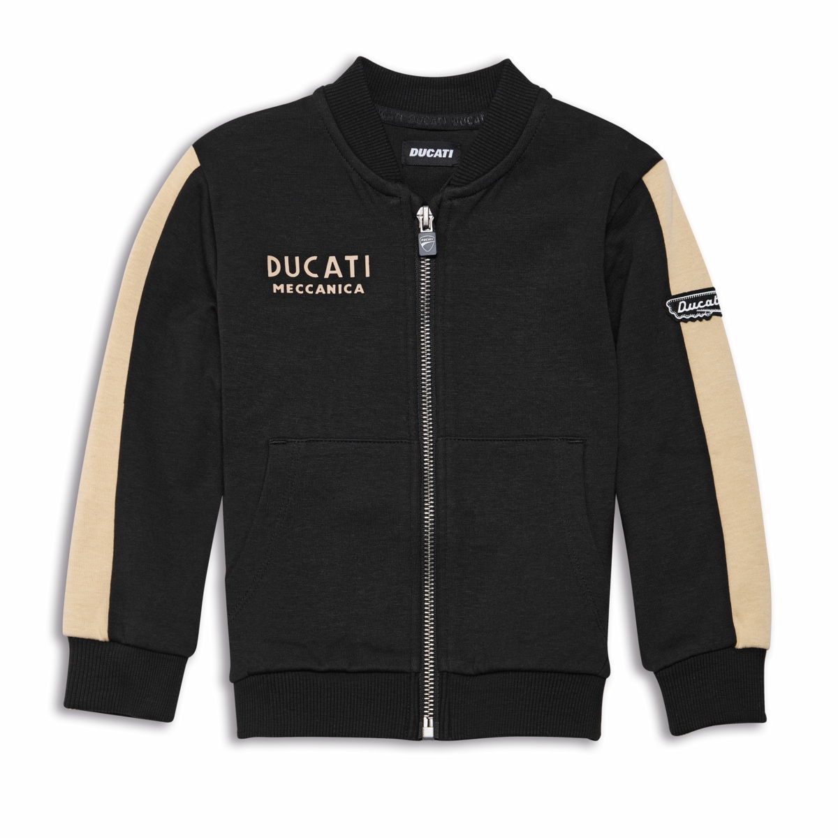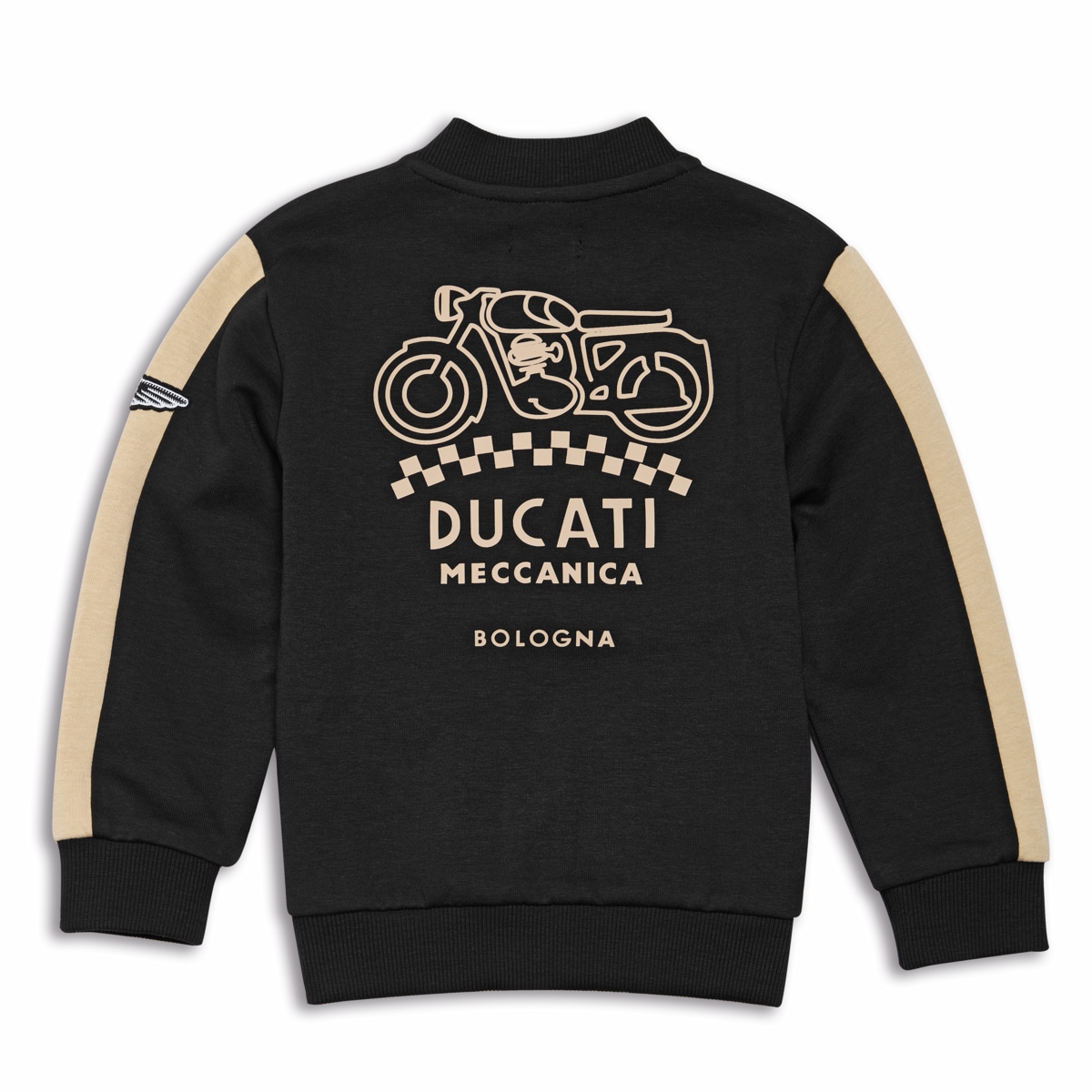 Aus Baumwoll-Sweatshirt und -Hose zusammengesetzter, zweiteiliger Anzug Historical 2.0 für Kinder, der Komfort und Bewegungsfreiheit gewährt. Die Farbe Schwarz ist mit beigen Streifen an den Ärmeln verziert, die dem Design Schwung und Kontrast verleihen. Die Personalisierung mit Aufdrucken des historischen Ducati Meccanica Logos am Sweatshirt und an der Hose würdigt mit authentischem und sofort erkennbarem Stil die Ursprünge der Marke. Dieser Anzug ist für die kleineren Ducati Fans ausgelegt und ideal, um jeden Moment des Tages mit Charakter und Zweckdienlichkeit zu begleiten.