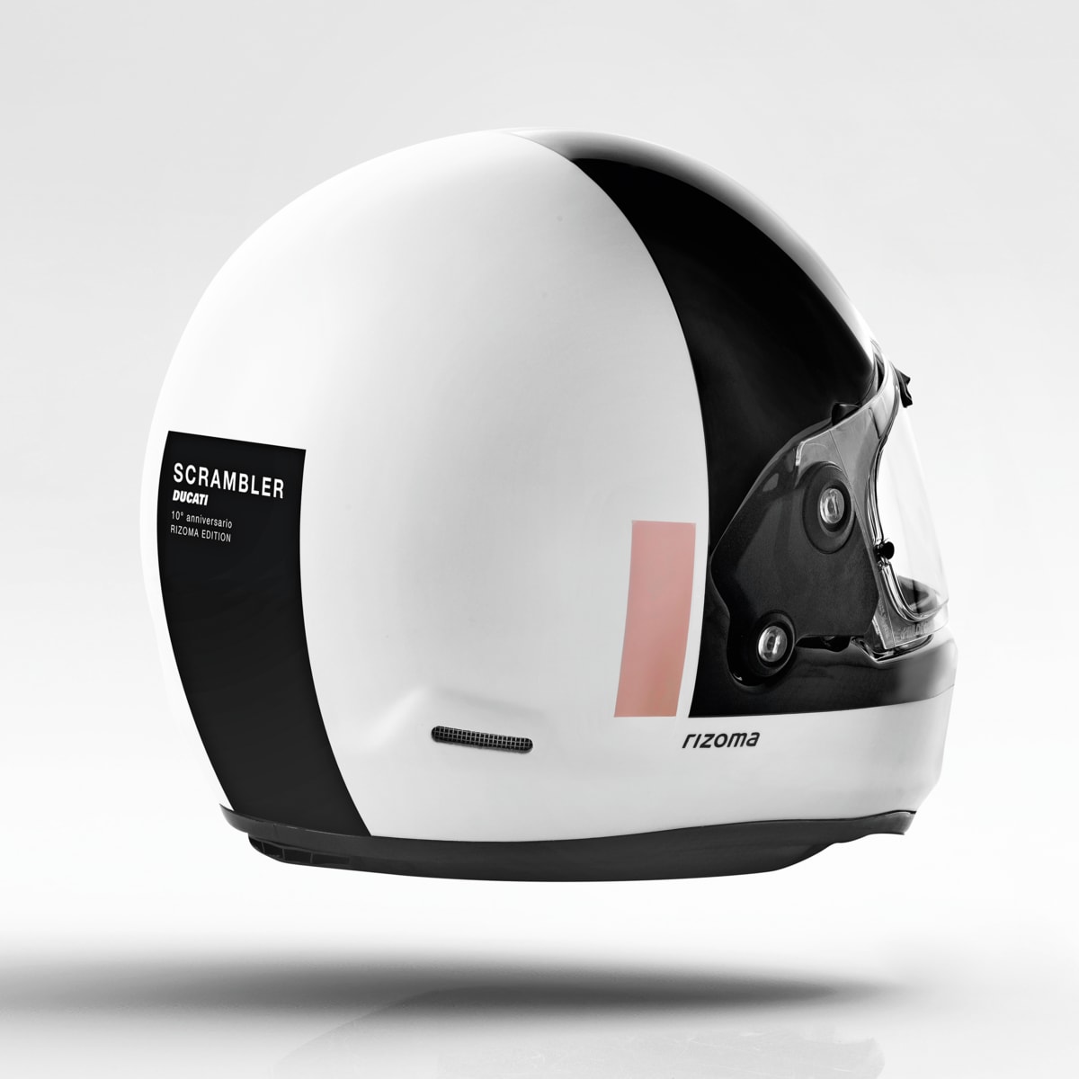 Exclusive road-use helmet developed from an Arai base and shaped by the visionary design talent of Rizoma. This limited edition is inspired by the iconic livery of the Scrambler Ducati 10° Anniversario Rizoma Edition, combining style, performance and exclusivity. The Peripherally Belted e-Complex Laminate outer shell, made with new materials, offers an excellent compromise between rigidity, strength and weight. The detachable, washable, non-allergenic inner liner provides support over a much wider area, thanks to the Facial Contour System (FCS), an elastic foam support that compresses and expands to ensure a more comfortable fit. The visor with VAS (Variable Axis System) technology is complemented by the internal visor with the exclusive Pinlock® patented adjustment system, which allows you to adjust the draft and fogging from the outside with a simple gesture. To further maximize comfort levels, the speaker housings and “Peel Away” cheek pads, which have a 5 mm detachable layer to add extra space together with greater flexibility in terms of fit. The minimalist, contemporary design is the key star feature of the Scrambler Rizoma helmet, with its glossy finish and bold color palette, where white, black and red are matched with an eye-catching "Metal Rose" detail, creating out-of-the-box elegance when you jump on the back of this bike and show off your own personality.