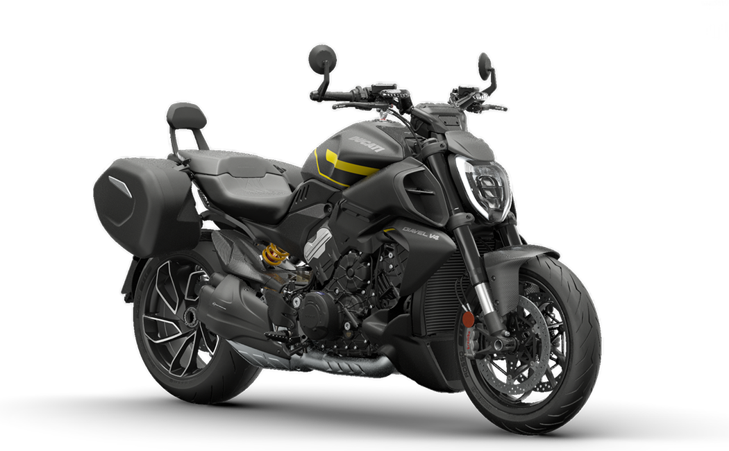 The proportions of the Ducati Diavel V4 are unmistakable, with the masses visually loaded on the front, the broad shoulders narrowing as they descend to the classic V-shaped sport tip. The air intakes, a breaking element in the side view, communicate the power of the V4 Granturismo, amplifying the dramatic effect of its presence in front view.