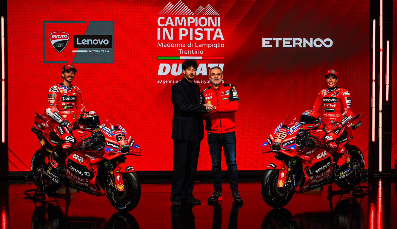 HomeBologna, January 28th 2025 – Ducati Corse and Eternoo are happy to announce a new and prestigious partnership. Eternoo will be an Official Partner of the Ducati Lenovo Team for the 2025 and 2026 seasons in the MotoGP World Championship. The Eternoo logo will be on the fairing of the bikes of Francesco Bagnaia and Marc Márquez, as well as on the arm of the Spanish rider suit.