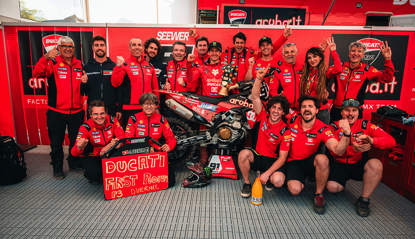Even though the moto got off to a rough start for the Ducati riders, they crucially didn’t lose heart. Regaining their rhythm, they began climbing through the field lap after lap. Jeremy fought his way up to fourth - just shy of a podium finish - but, driven by the roar of his home crowd and a sensational final lap, he surged into third. With that heroic charge, he delivered the first-ever podium for the Borgo Panigale company in just their sixth Grand Prix appearance in motocross history.