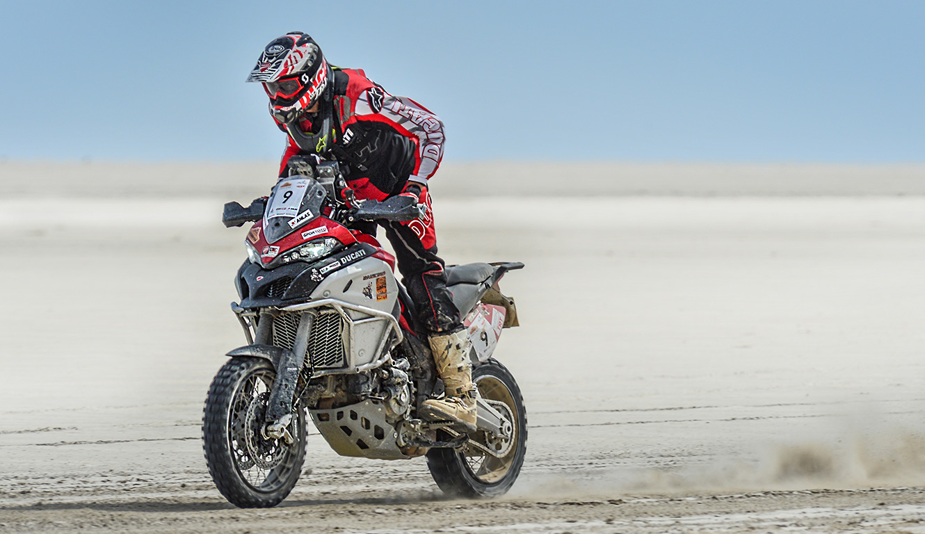 The Multistrada 1260 Enduro has covered 7 stages in 7 days, with a daily average of 450 km for 8 hours of navigation per day. It climbed a mountain up to 3,000 metres above sea level and reached a top speed of 203 km/h on the salt lake of Tuz Golu.