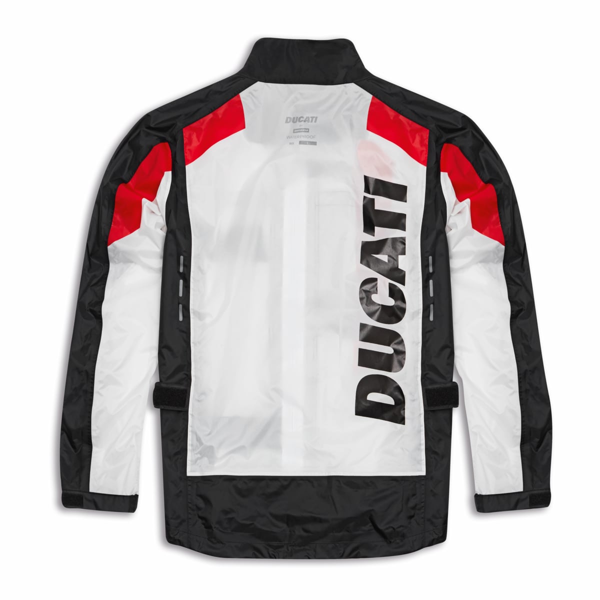 Top technical features and performance match with the iconic design of this waterproof jacket designed exclusively for Ducati by Aldo Drudi based on specific briefs from Ducati test riders in Borgo Panigale. Made of PVC-free polyester and polyamide, these two materials prevent the color from fading and allow to retain the original look in time. Absolutely waterproof, equal to 10,000 water columns, optimized by inner heat-sealed seams, with double front closure with Acqua-stop technology and a large waterproof outer pocket, applied on the chest with an advanced technique. A lightweight item, resistant and extremely practical, easy to wear and easy to pack in the relevant pouch. Volume adjustment on the arms and sides and the double front closure maximize comfort. With reflex prints and available in the black/white and HV yellow/black color themes, it adapts to the look of every rider, without giving up the iconic Ducati style, even in the most challenging weather conditions.