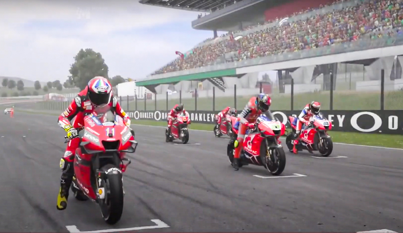 Gara impeccabile per il campione Andrea Saveri che, nonostante la caduta iniziale, arriva primo con un distacco di quasi 30 secondi sul resto gruppo. Sessione più burrascosa invece per gli altri giocatori, con diverse cadute che hanno più volte rimescolato le carte in tavola. Il meglio arriva alla fine con Petrucci che all’ultimo giro supera e mette in difficoltà il pro player “Davidegallina23”, che fino a quel momento aveva difeso senza problemi la seconda posizione. Il pilota ternano cade però alla curva 4 perdendo il posteriore e lascia strada libera a Michele Pirro, che a sua volta aveva sfruttato una caduta di Gallina per guadagnare una posizione. Tutta in salita e sotto le aspettative invece la gara di Bagnaia e di Pirillo, mai coinvolti nelle posizioni che contano.