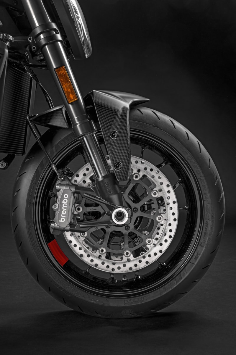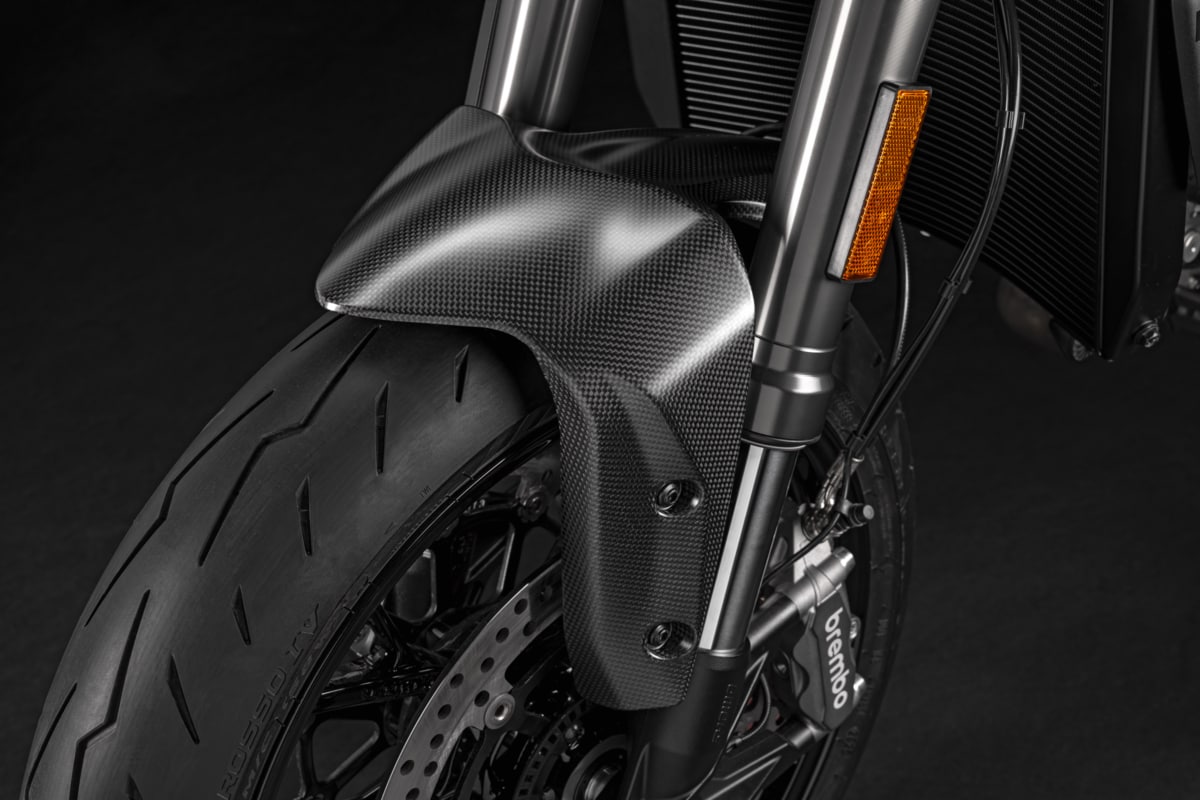カーボンファイバーならではの美しさと軽さが融合したこのアクセサリーは、標準の塗装部品に代わる部品として誕生し、Monsterの力強いフロントエンドを個性的なエレメントで引き立てます。