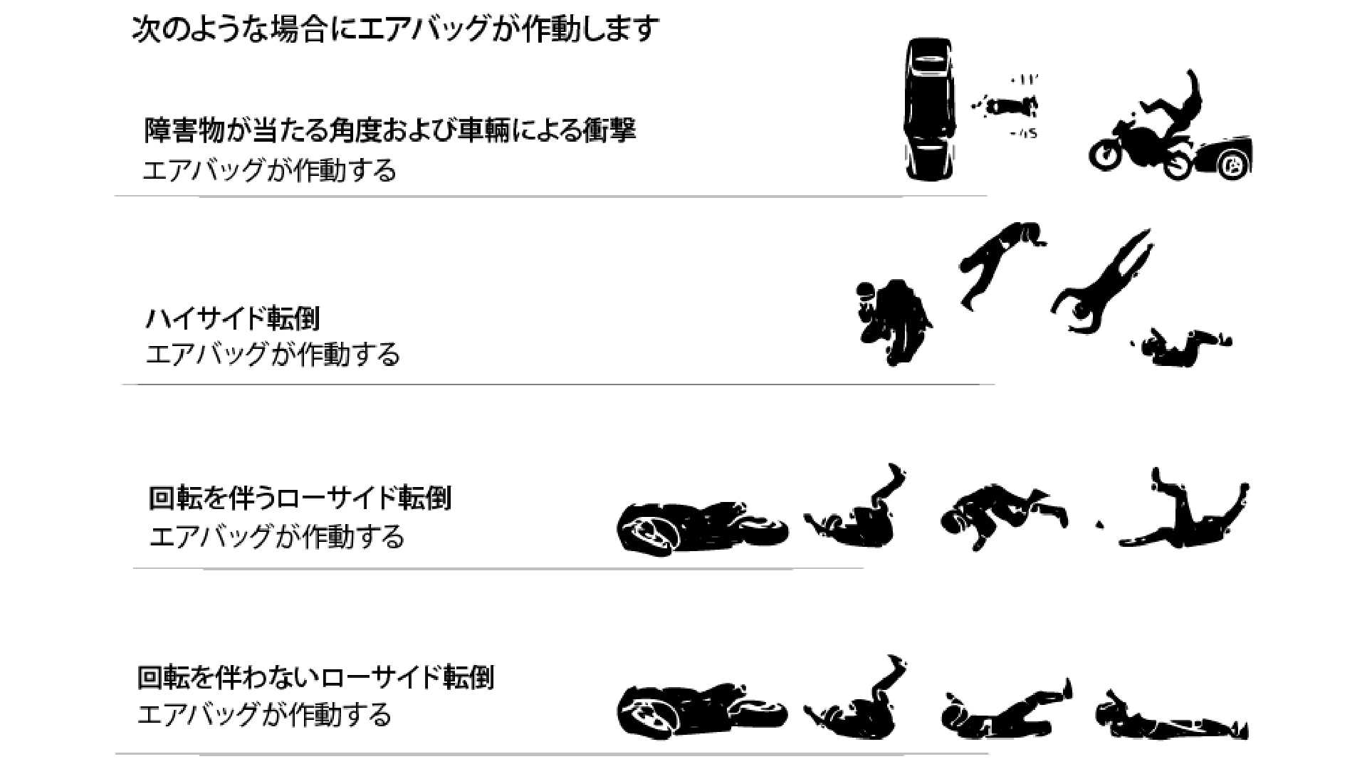 システムは、スライド、転倒、物体や他の車両との衝突、または追突が発生した場合(交差点で停止する場合など、静止した車両との衝突の場合でも)に、エアバッグを作動させます。
