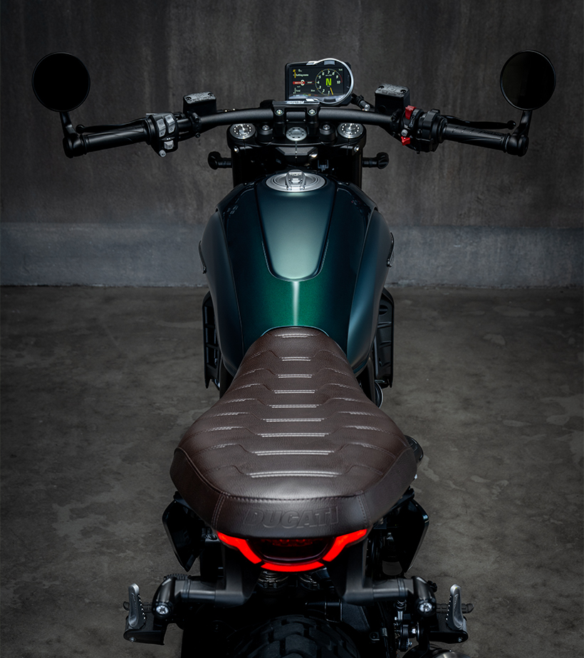 La posición de conducción de la Scrambler Ducati 10° Anniversario Rizoma Edition garantiza agilidad, ligereza y seguridad en cualquier situación. Con una altura del asiento de 795 mm, tanto el piloto como el pasajero están seguros de sentirse cómodos y el piloto puede llegar fácilmente al suelo con los pies para un mejor manejo de la moto en parado.