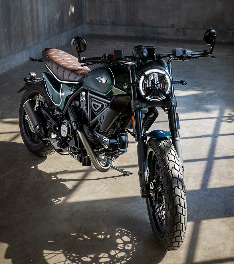 La Scrambler Nightshift luce elegante y sofisticada, gracias a su nuevo esquema de color Verde Esmeralda, asiento café con acabado especial y rines de radios completamente negros.