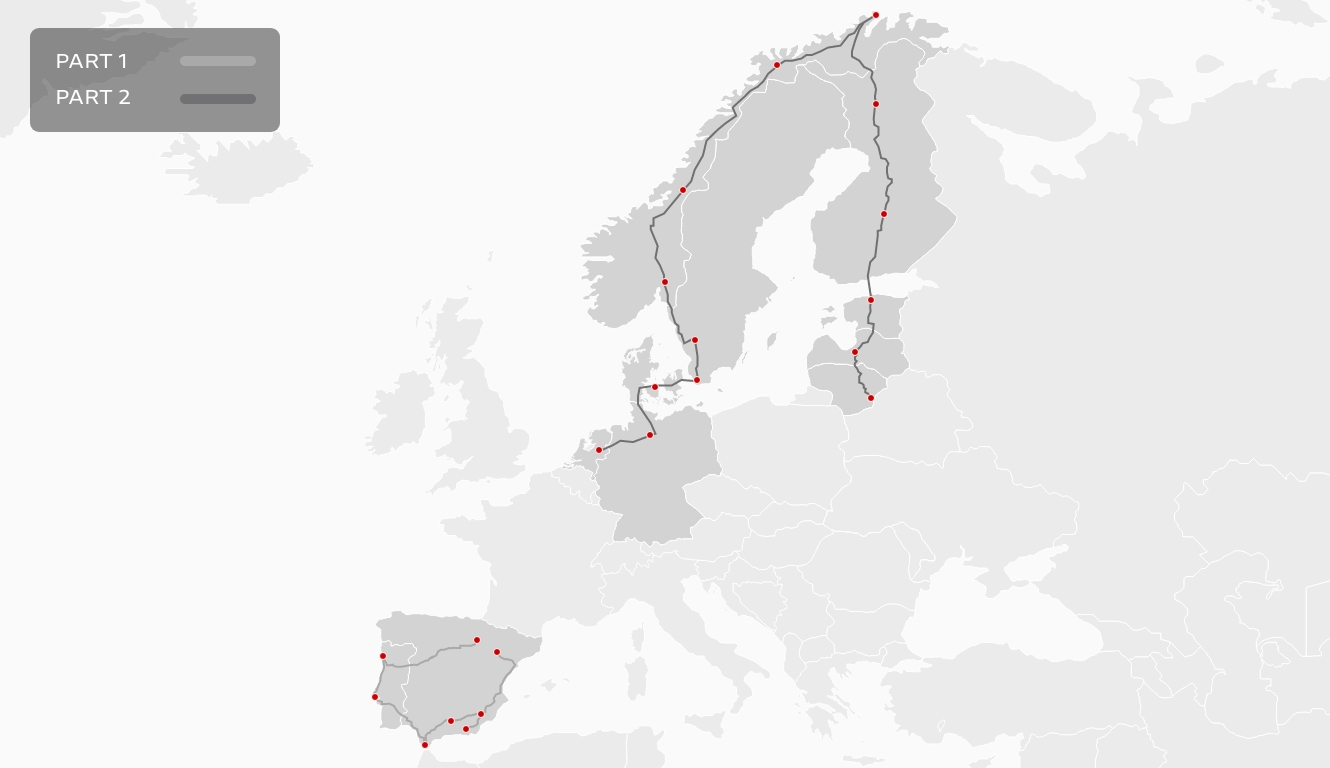 The second part of the adventure took us to the North, crossing 16 countries. After driving through the roads of the Baltic countries, we took the ship to cross the Gulf of Finland and went up along the 2,000 km of dirt road of Finland, under the midnight sun.