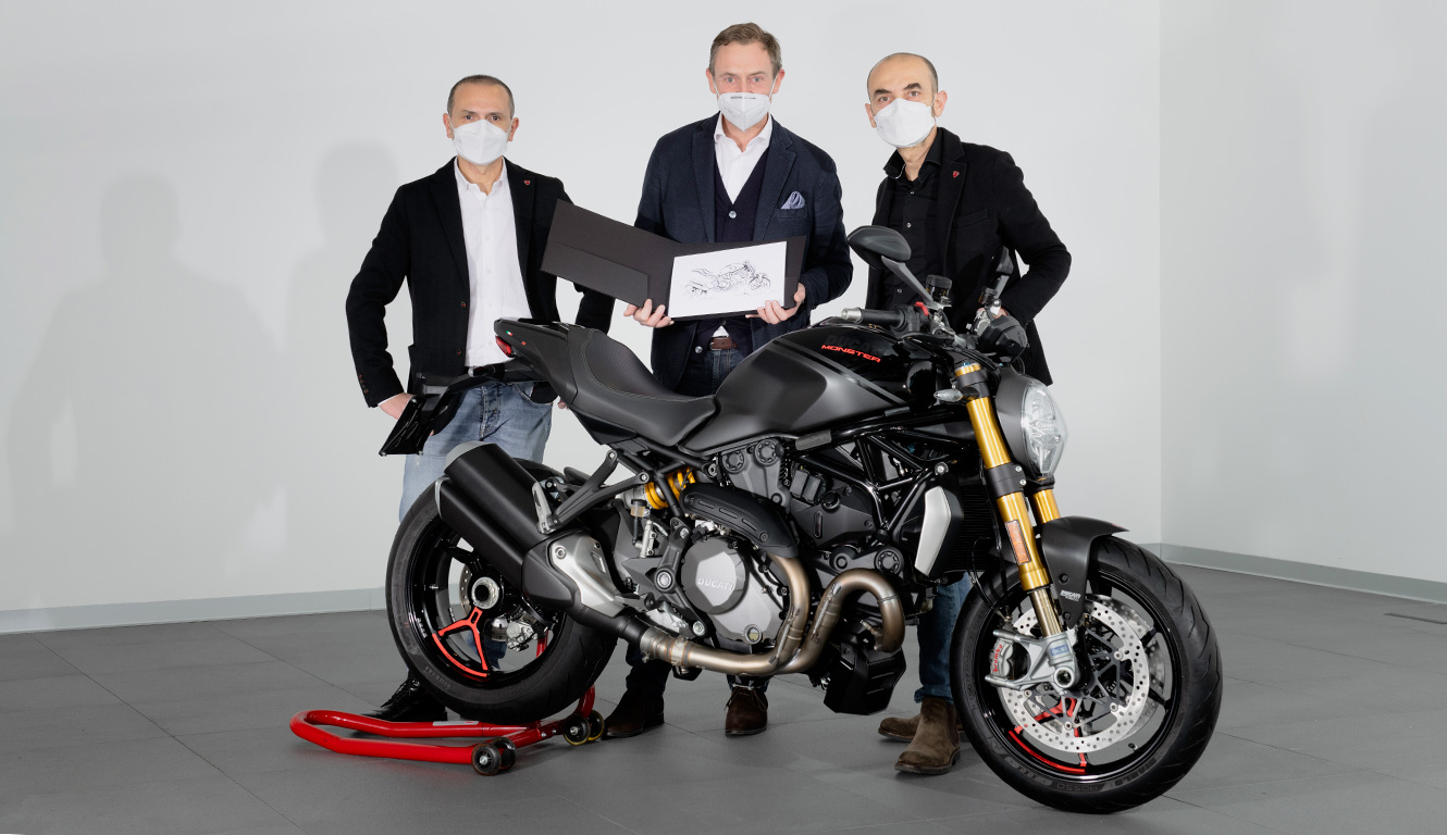 Mr. De Rose, who ordered the Monster 1200 S from the Ducati dealer in Milan, was invited to Borgo Panigale for the occasion. The bike was personalized with a plate bearing the number 350,000 and was delivered to the owner accompanied by a certificate of authenticity signed by Claudio Domenicali and a sketch of the Monster signed by the designer Angelo Amato.