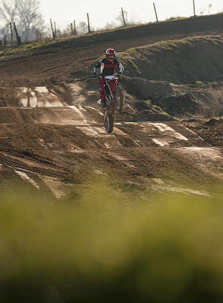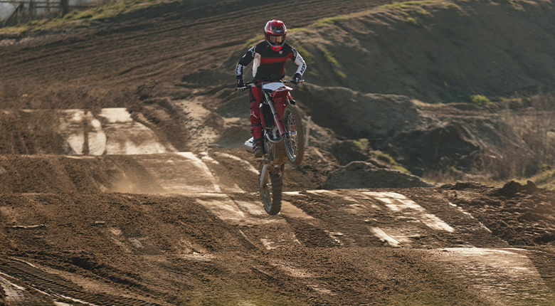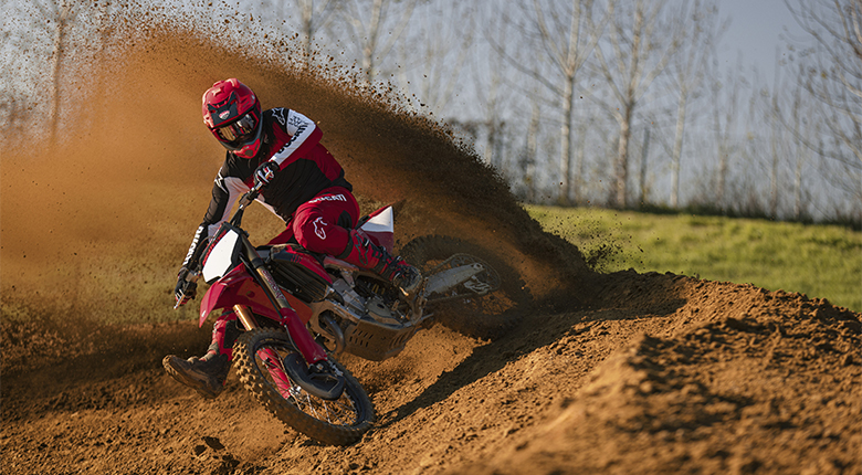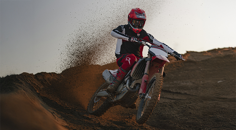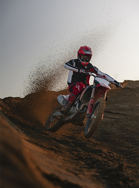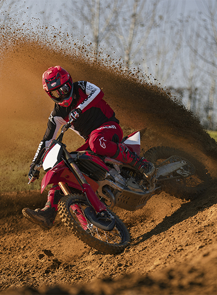 The Desmo450 MX Factory integrates components developed for racing, such as the Holeshot device that guarantees greater stability and increased acceleration. Its equipment is rounded out with a disc protector and engine guard plate, designed to protect the braking system and engine from mud, stones and debris during off-road riding.