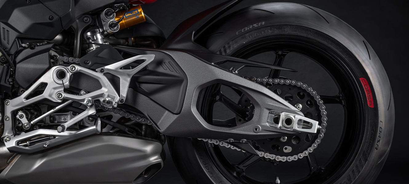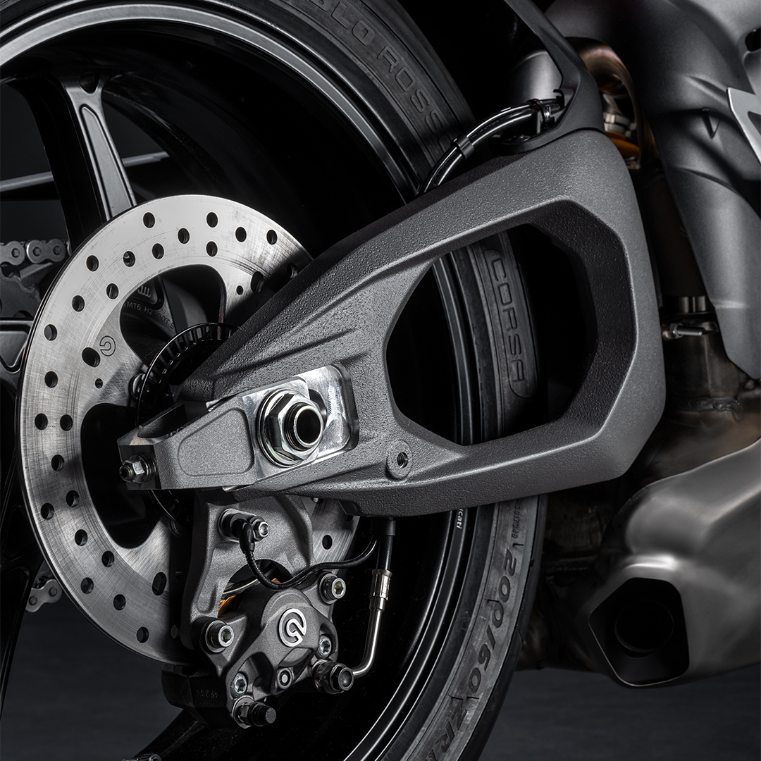 The new Ducati Hollow Symmetrical Swingarm perfectly marries aesthetics and functionality. A complex, sophisticated and elegant structure, it stands out among sports bikes for being coupled with an exhaust positioned under the engine.