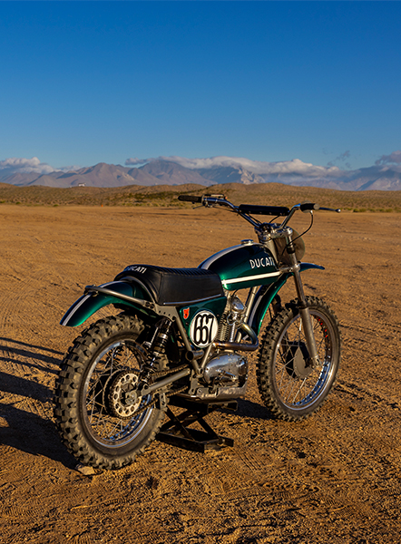 Inspired by Ducati’s 1969 win in the Baja 500 on a Scrambler 350, the U.S. importer, Berliner Motors, requested the development and production of the 450 R/T Desmo, as one of Ducati’s earliest purpose-built, off-road motorcycles, created to capture the growing desert racing market at the time. In Ducati’s centennial year, the motorcycle serves as a deliberate symbolic choice, connecting the brand’s heritage to its entry into motocross, supercross, and grassroots off-road racing in the U.S.