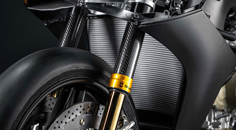 The suspension also sets a new world first: the Superleggera V4 Centenario is the first road bike to feature the pressurized Öhlins NPX 25/30 Carbon fork with carbon fiber sleeves made from unidirectional layers to achieve maximum weight savings compared to conventional production. The weight saving compared to the Panigale V4 R is 8%, rising to 10% compared to the standard Panigale V4, with a tangible improvement in direction changes and front-end sensitivity.