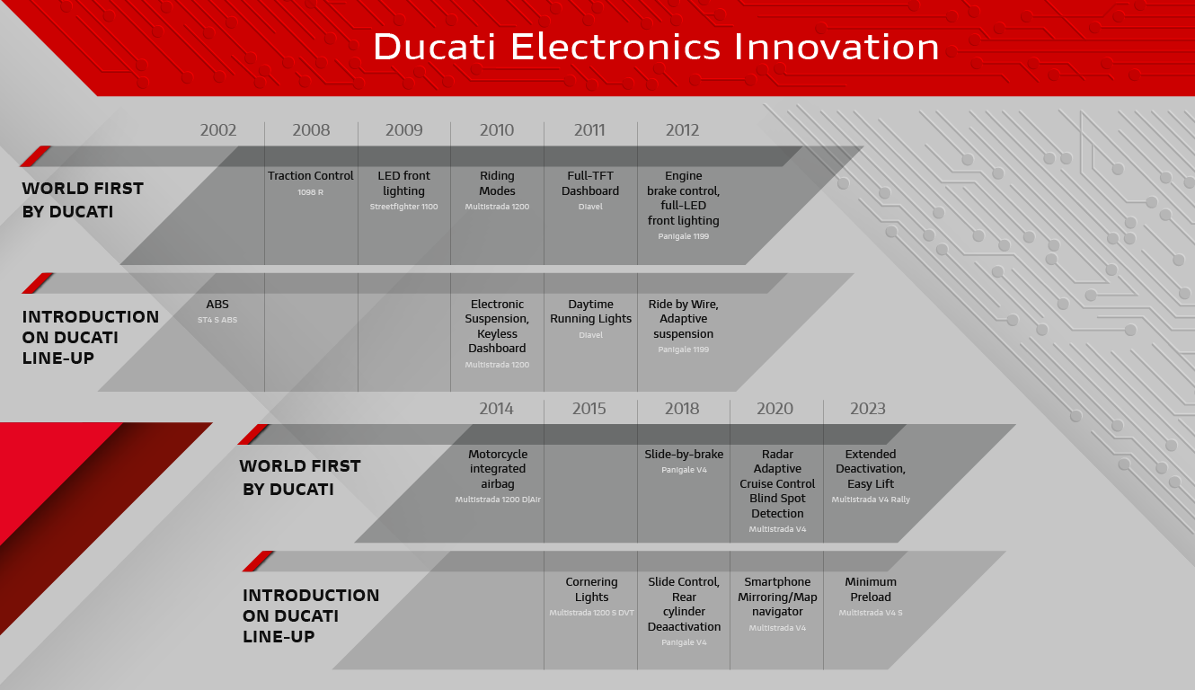 In 2008, with the 1098R, Ducati was the first motorcycle manufacturer to introduce Traction Control on a motorcycle, moving the performance and safety benchmarks of super sports bikes forward. One year later, the LED headlight introduced on the Streetfighter 1100 represented another Ducati world first. In 2010, Ducati presented the first motorcycle in the world capable of "changing character" thanks to the presence of the Riding Modes: the Multistrada 1200 S. Other electronic innovations introduced by Ducati include the TFT instrumentation of the Diavel, in 2011, another example of a technical solution that has now become a standard on motorcycles in every segment. In 2012, the 1199 Panigale, which received the prestigious design award, the Compasso d'Oro, saw the introduction of the Full-LED light cluster and electronic engine brake management in the motorcycle category . Since safety is an essential aspect for Ducati, in 2014 the Borgo Panigale manufacturer and Dainese introduced the first motorcycle with an integrated system capable of communicating with the airbag in the jacket: the Multistrada 1200 Touring D|Air. At the time, airbag systems did not guarantee current safety standards, while the sophisticated Multistrada 1200 Touring D|Air system sent the activation signal in just 20 ms in case of a crash or slide (TBD explanation). In 2018 Ducati introduced the Slide By Brake system that allows controlled power sliding under braking on the Panigale V4, while in 2020, with the Multistrada V4, Ducati was the first motorcycle manufacturer to introduce radars to the world of two wheels, which allowed the implementation of the Adaptive Cruise Control and Blind Spot Detection systems. 2023 saw the arrival of extended deactivation on the Multistrada V4 Rally, a sophisticated system that reduces fuel consumption and heat by switching off the two rear cylinders. These are the innovations introduced by Ducati in the world of two wheels, many of which are now standard on motorcycles "over 500 cc". (link to the roadmap of technological innovations here).