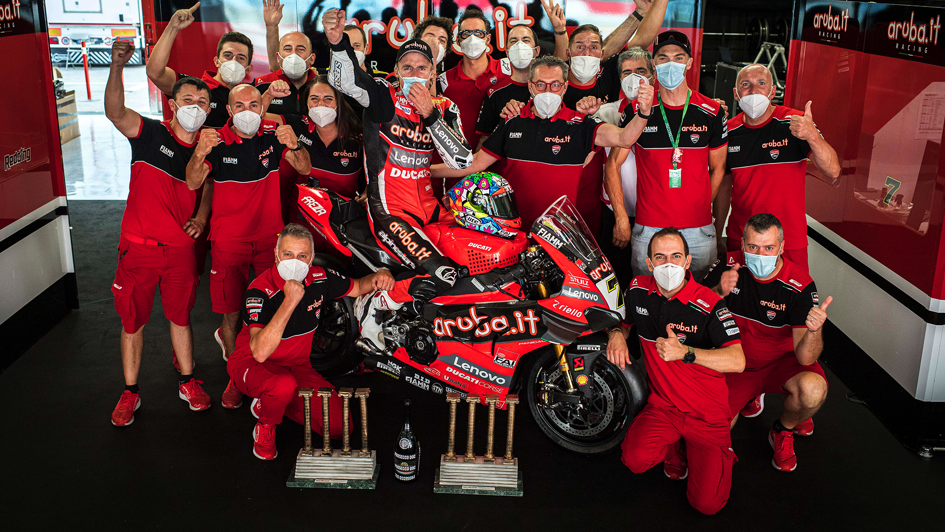 The Aruba.it Racing - Ducati team celebrates its fifth victory in the 2020 WorldSBK season thanks to the sensational performance of Chaz Davies. Scott Redding, however, can’t find the right feeling with his Ducati Panigale V4 R and closes Race-2 in sixth place.