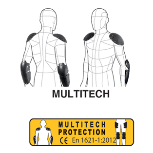 • EN1621-1 certification, Type A, level 1. Transmitted energy 29.8kN (shoulder) 29.6 kN (elbow) > certified protection