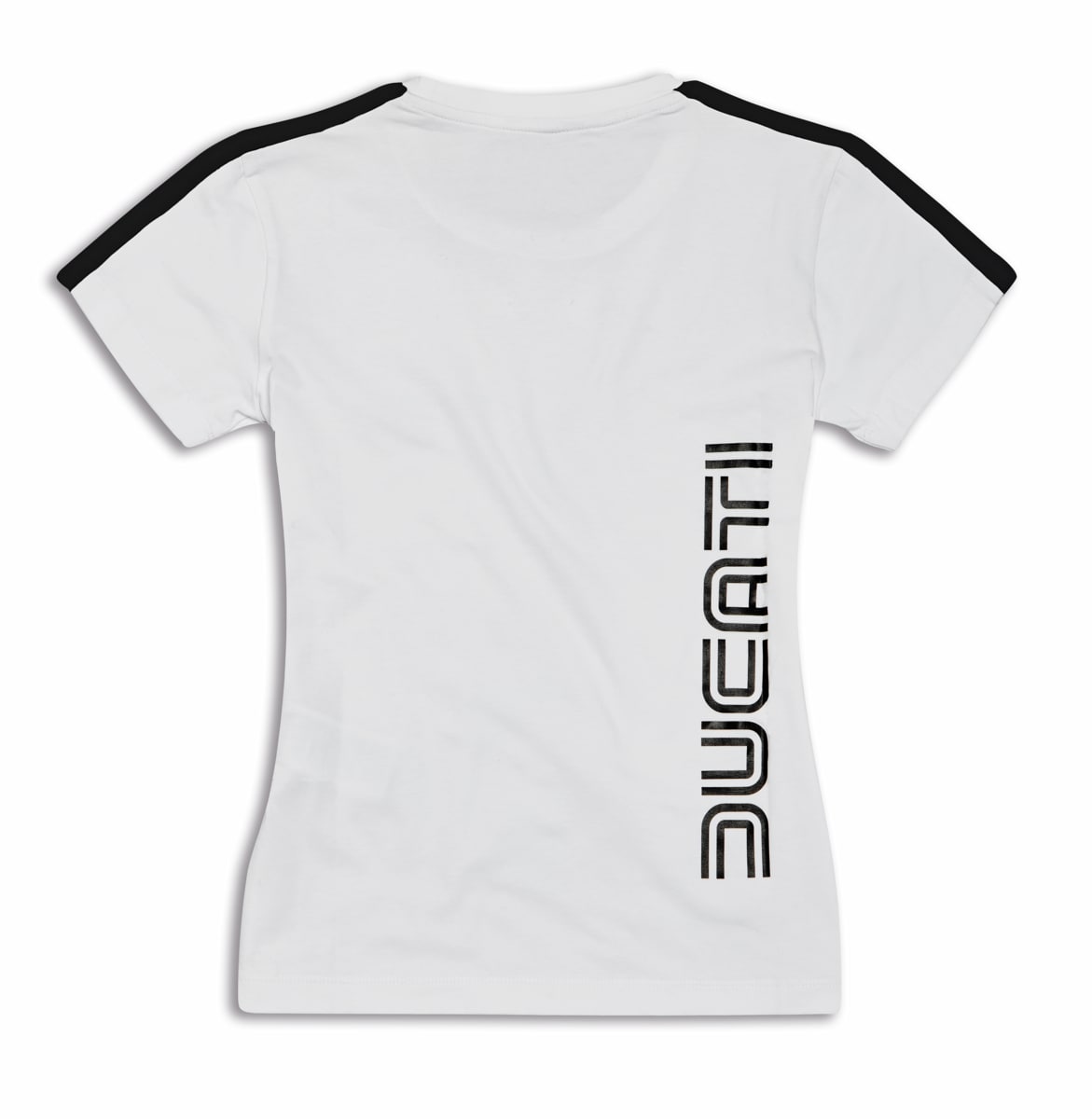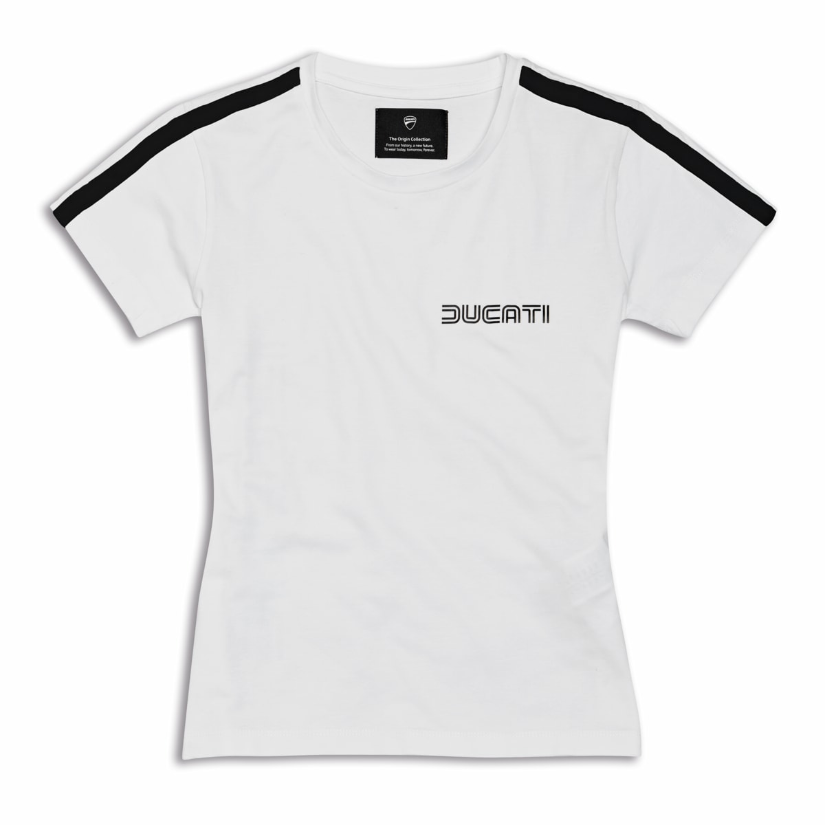 The women’s Heritage T-shirt, made from stretch cotton, is designed for comfort, freedom of movement, and a flattering modern fit. Its crisp white tone is contrasted by black shoulder bands, creating a sharp, refined effect that adds a touch of dynamism to the design. Part of the Ducati Centennial capsule, it reinterprets the brand’s aesthetic with sleek contours and distinctive details inspired by the iconic Giugiaro logo.