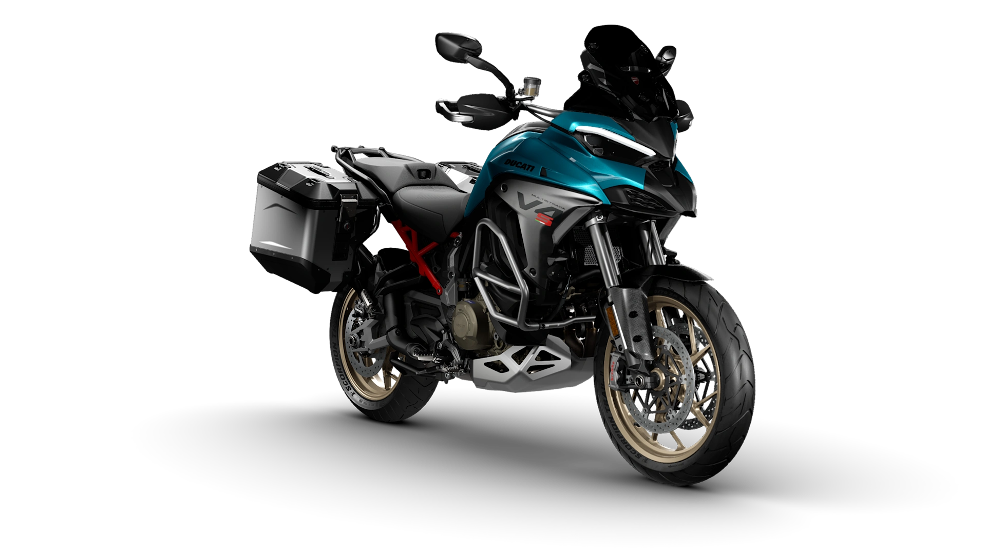 Uranus Blue livery, Ducati Red steel subframe, Dark Gold cast wheels, aluminum Brembo Stylema brake calipers, and Sport and Adventour Touring packages.