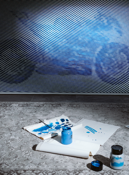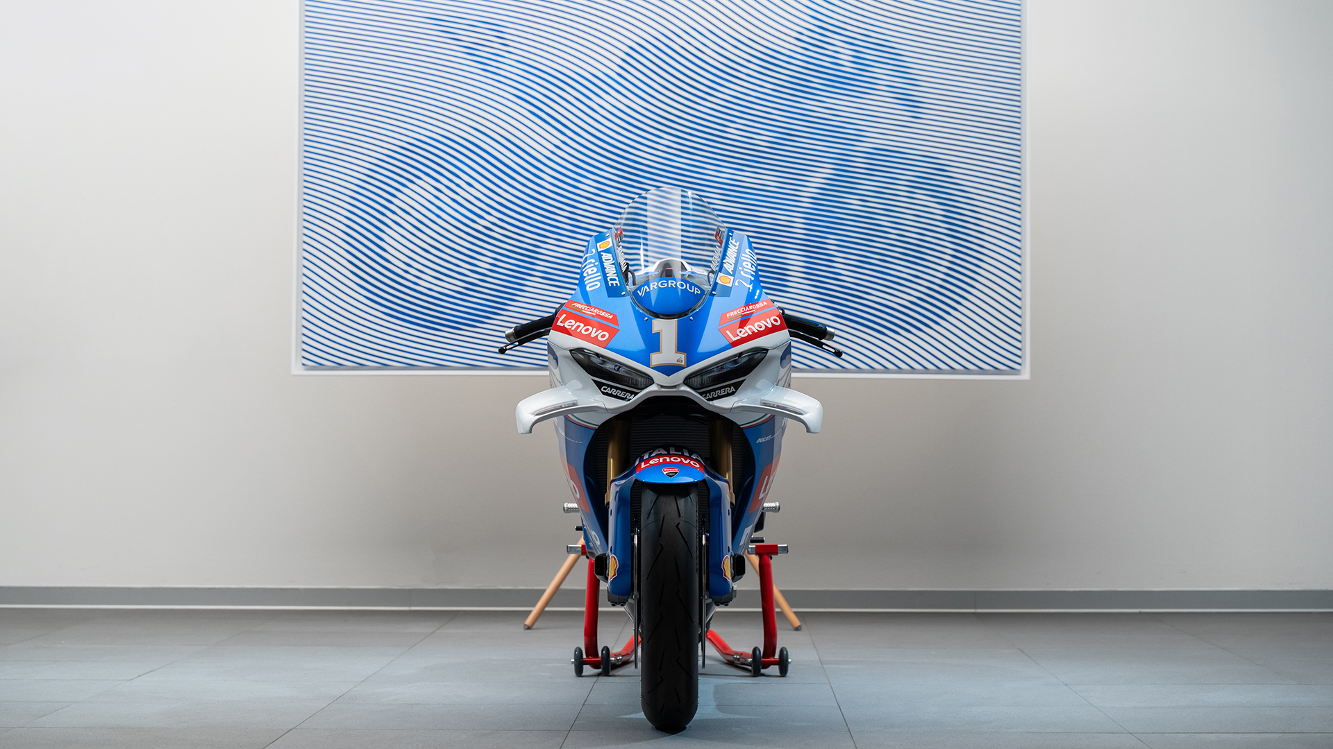 Andrea Crespi signs a never-before-seen work inspired by the Panigale V4 Tricolore Italia, a collector's bike in a numbered and limited edition of only 163 examples. His work, composed of fluid lines, optical illusions and trajectories in motion, reinterprets the iconic blue of the livery in a visual vortex giving body to a new perceptual dimension of movement. A 1:1 scale canvas, where Light Blue, the same blue that dressed Ducati's triumphs at Mugello 2024, becomes narrative and symbol. From this work comes a limited series of 163 small-scale lithographs, reserved for enthusiasts who have chosen the Panigale V4 Tricolore Italia. Each is numbered and signed by the artist, just as each example of the bike carries the signature of Francesco Bagnaia of the Ducati Lenovo Team, underlining its uniqueness and exclusivity.