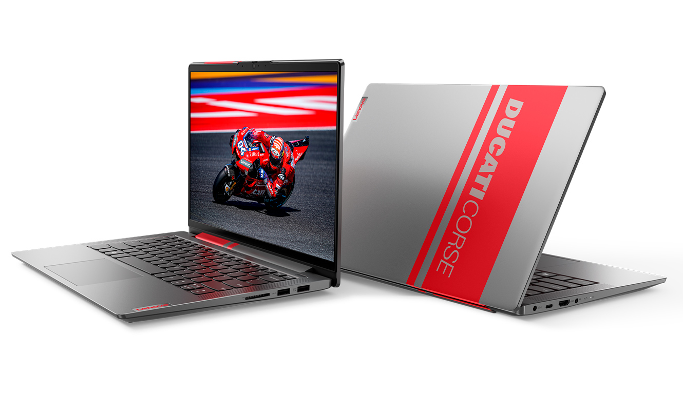 The Lenovo brand is visible on Ducati racing bikes and on the uniforms of the MotoGP riders and now, for the first time at CES® 2020, enthusiasts will be able to see the Ducati brand on a thin and light notebook PC in a special edition: the Lenovo Ducati 5 with Windows 10.